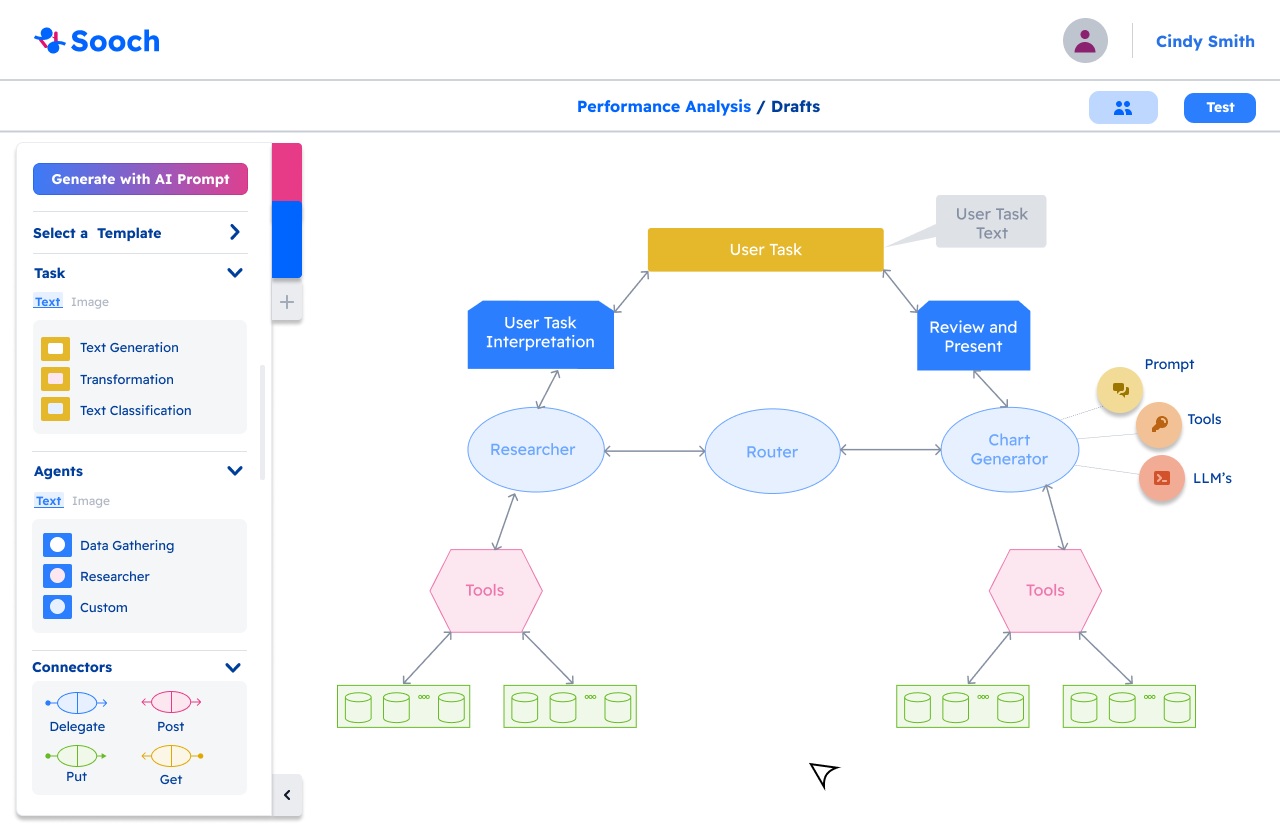 After completing the Prompt, Tools, and LLMs fields, the Researcher circle will turn a darker blue, signaling that the section is complete. The user can then connect the workflow components using a drag-and-drop arrow system. Our team opted for this drag-and-drop interaction to provide a more intuitive and user-friendly experience.