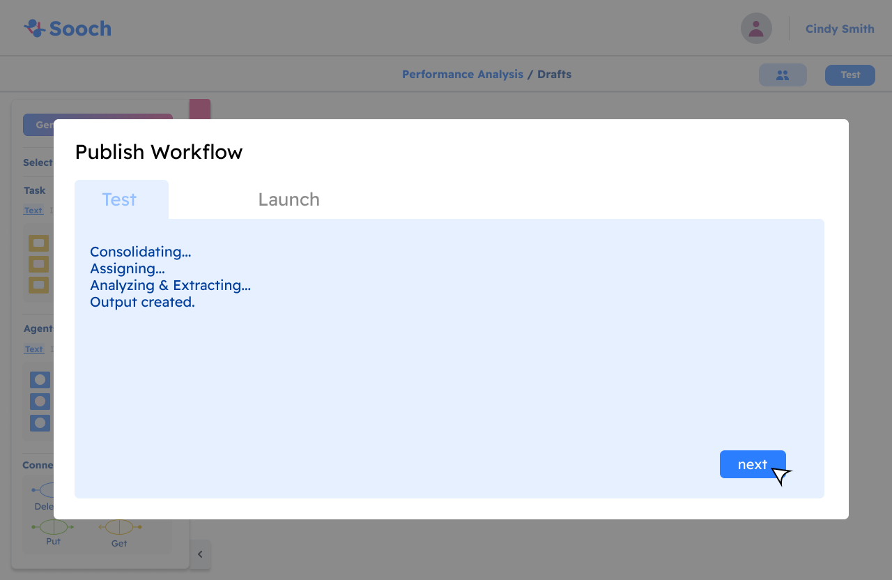 Once the application is complete, the user can proceed to test and launch it. A Test button, located at the top-right corner of the workspace, ensures easy access. Clicking the button opens a testing popup, where the user can initiate the testing process. After testing is complete, the user can validate the application. Once validated, the project becomes accessible on the homepage, appearing alongside previously completed applications.