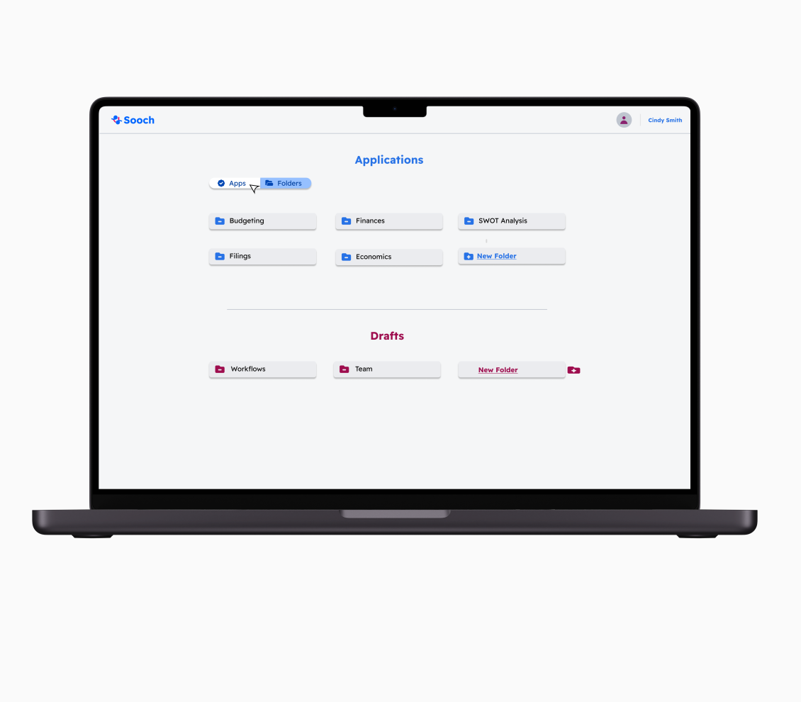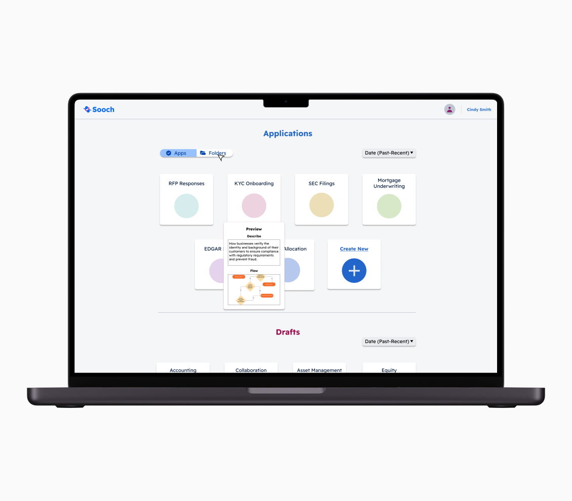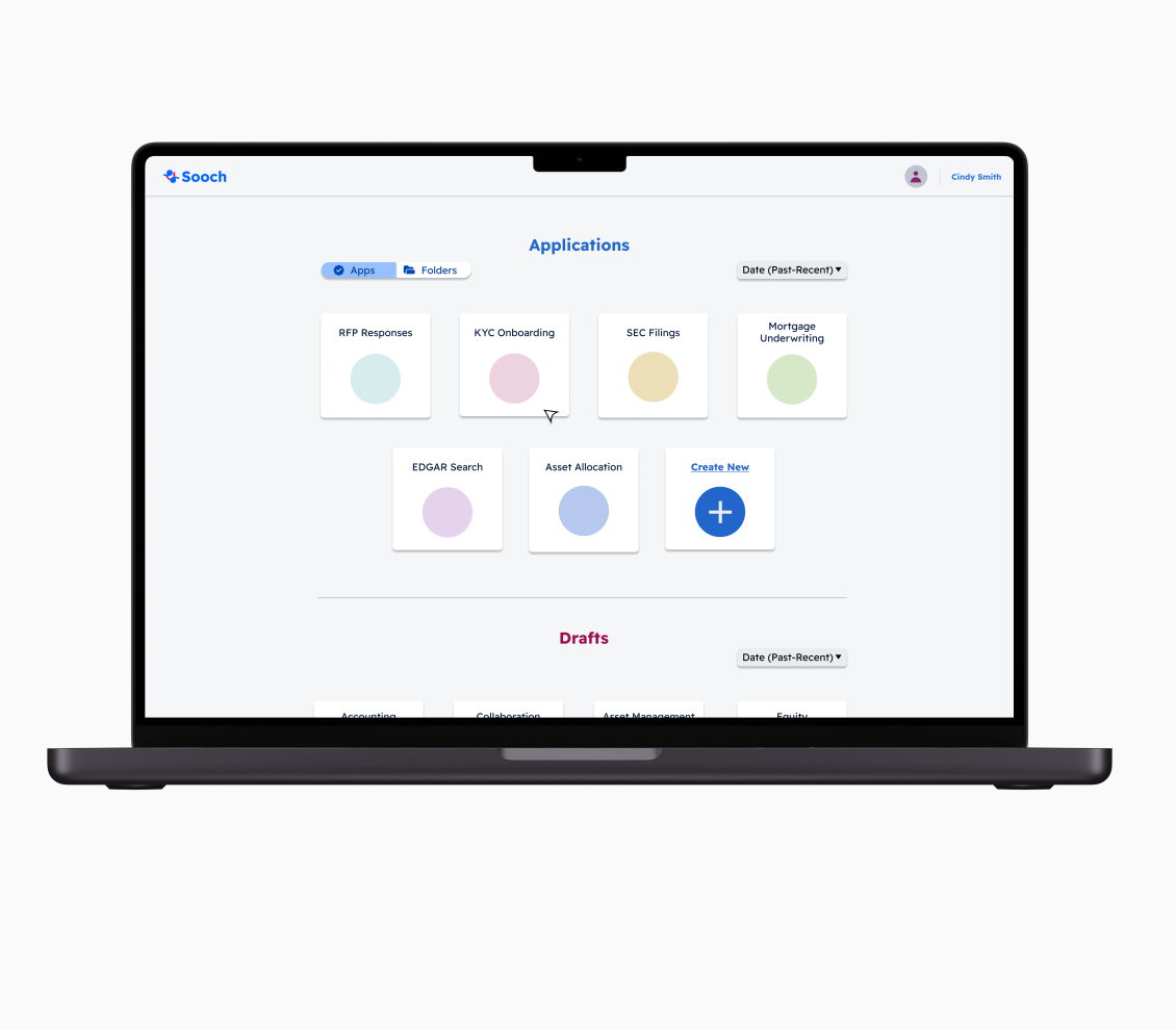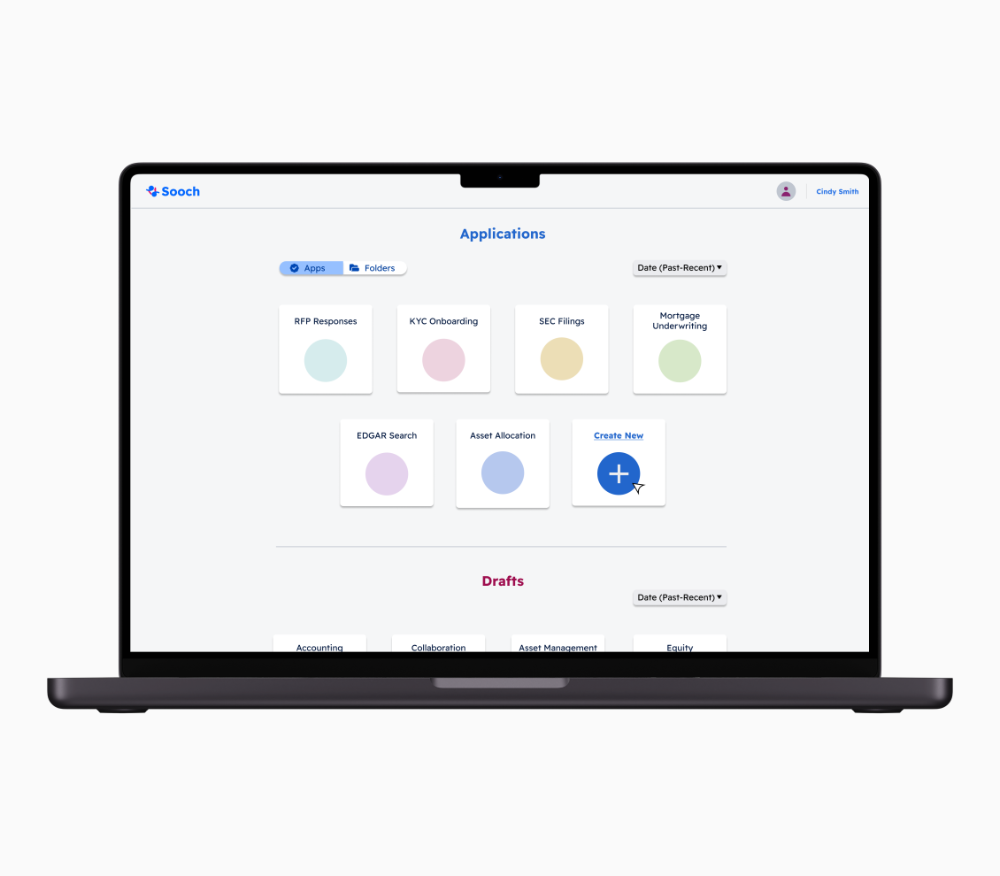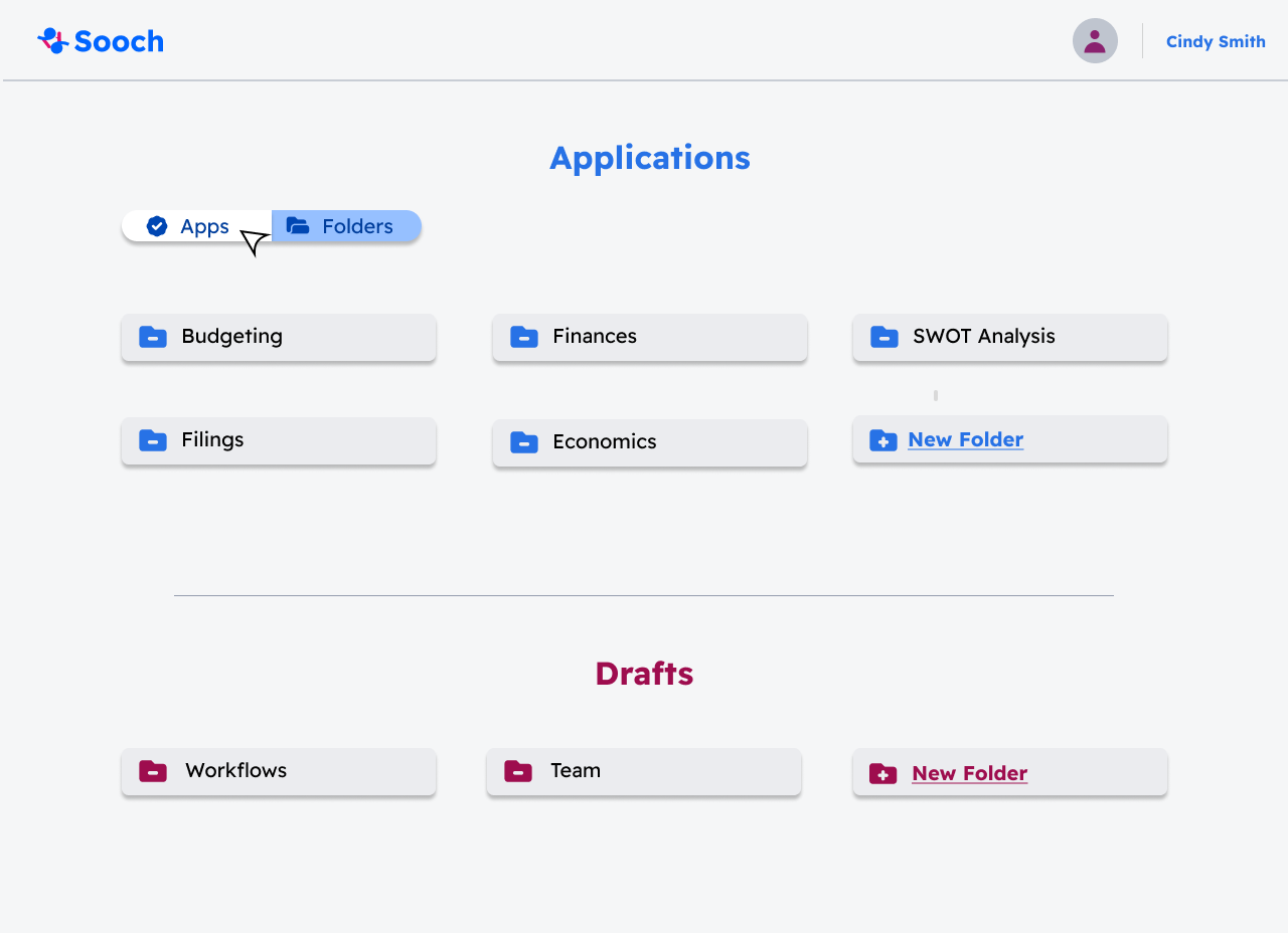 Users can organize and view their applications and drafts within folders for easier management. They can also start a new project directly from the homepage by clicking the plus (+) icon. As shown here, we applied different colors to indicate when a button is selected, using a secondary color from our palette. These color distinctions provide users with a more intuitive experience, clearly signaling their current location and navigation within the application.