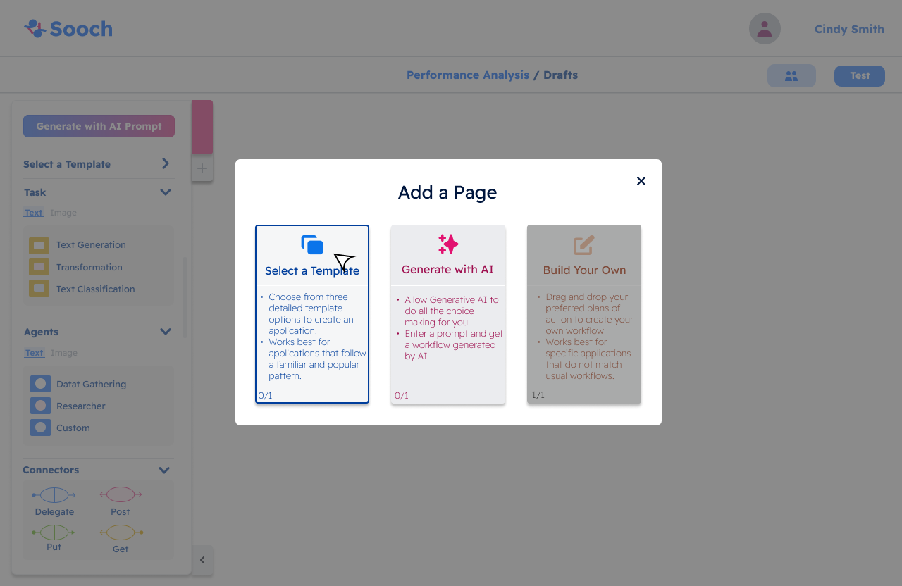 The second way users can create their application is by selecting a template. This can be done either by choosing the Template option from the menu bar or by clicking the plus (+) icon to add a new tab. If the user selects Add a New Tab, it will open the Add a Page popup, presenting three workflow options. Alternatively, selecting Template directly from the menu takes the user straight to the template selection screen, where they can choose between Collaboration, Supervisor, or Hierarchical templates.