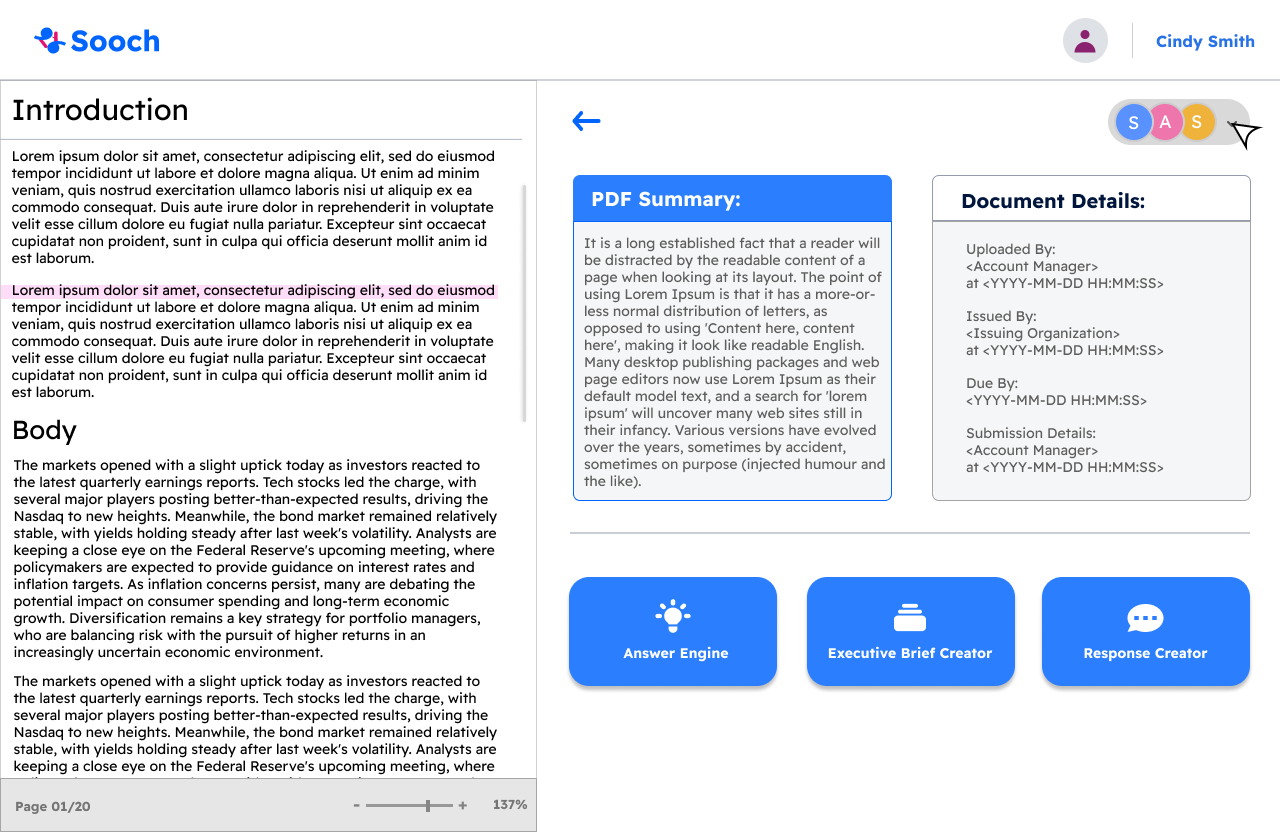 When the user selects a document from their history, they will be directed to a view of that document, where they can access the Answer Engine, Executive Brief Creator, and Response Creator options. Below, I will provide an overview of each feature.