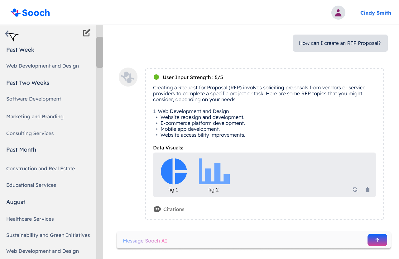 The Answer Engine: The Answer Engine includes a chatbot feature that allows users to ask questions and receive AI-generated responses, assisting them in navigating the RFP process. The design prioritizes clarity and readability, ensuring an intuitive experience for users. The interface displays the history on the left sidebar, while the chatbot occupies the right side of the screen, providing a streamlined layout for easy access and interaction.